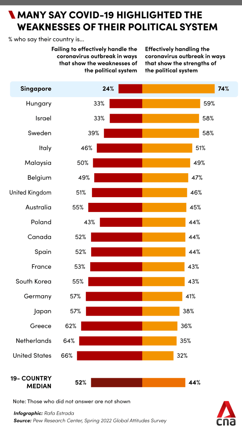 In Singapore, however, 74 per cent per cent said the opposite - that their country was effectively handling the outbreak in ways that show the strengths of the political system.