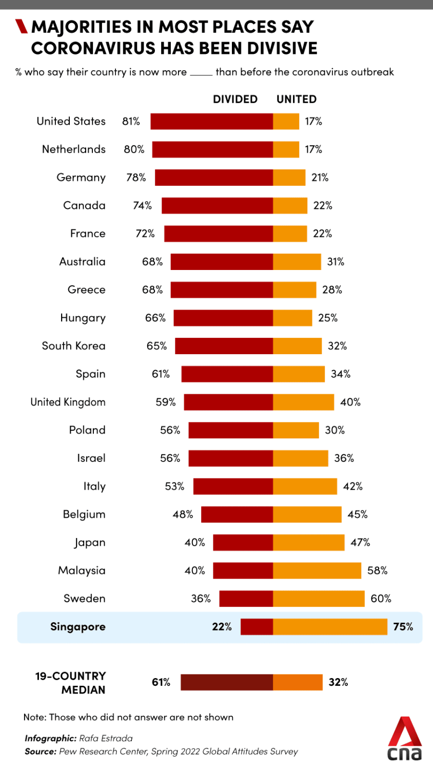 On the other hand, 75 per cent of the Singaporeans polled said their country was now more united than before the pandemic.