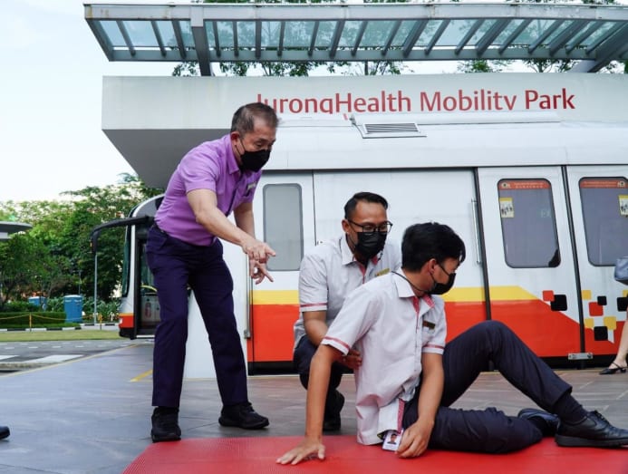 The training also covers other vulnerable groups, such as wheelchair users and the visually impaired. A practical session is held at the Jurong Community Hospital Mobility Park fitted with steps, slopes and a "mock-up" MRT carriage, bus and taxi, where therapists from the hospital guide SMRT staff on how to assist priority passengers.