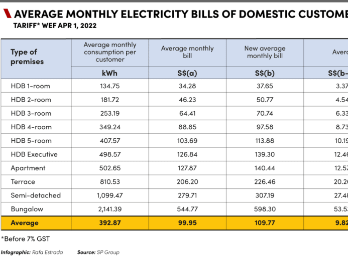 The increase means the average monthly electricity bill for families living in HDB four-room flats will go up by S$8.73 before GST.
