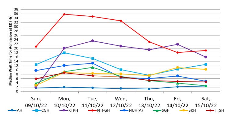 Daily median waiting time for admission at hospital emergency departments in Singapore, from Oct 9 to Oct 15, 2022. (Graph: MOH)