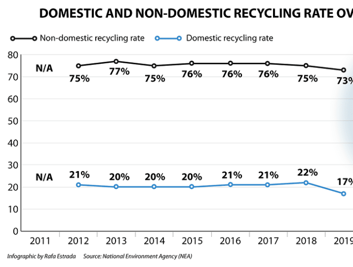Both of these figures saw a drop the next year. Among households, the recycling rate fell from 22 per cent in 2018 to 17 per cent in 2019, while the non-domestic recycling rate decreased from 75 per cent in 2018 to 73 per cent.