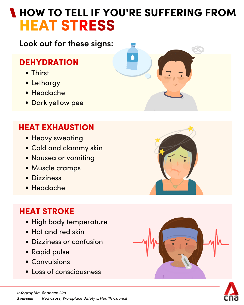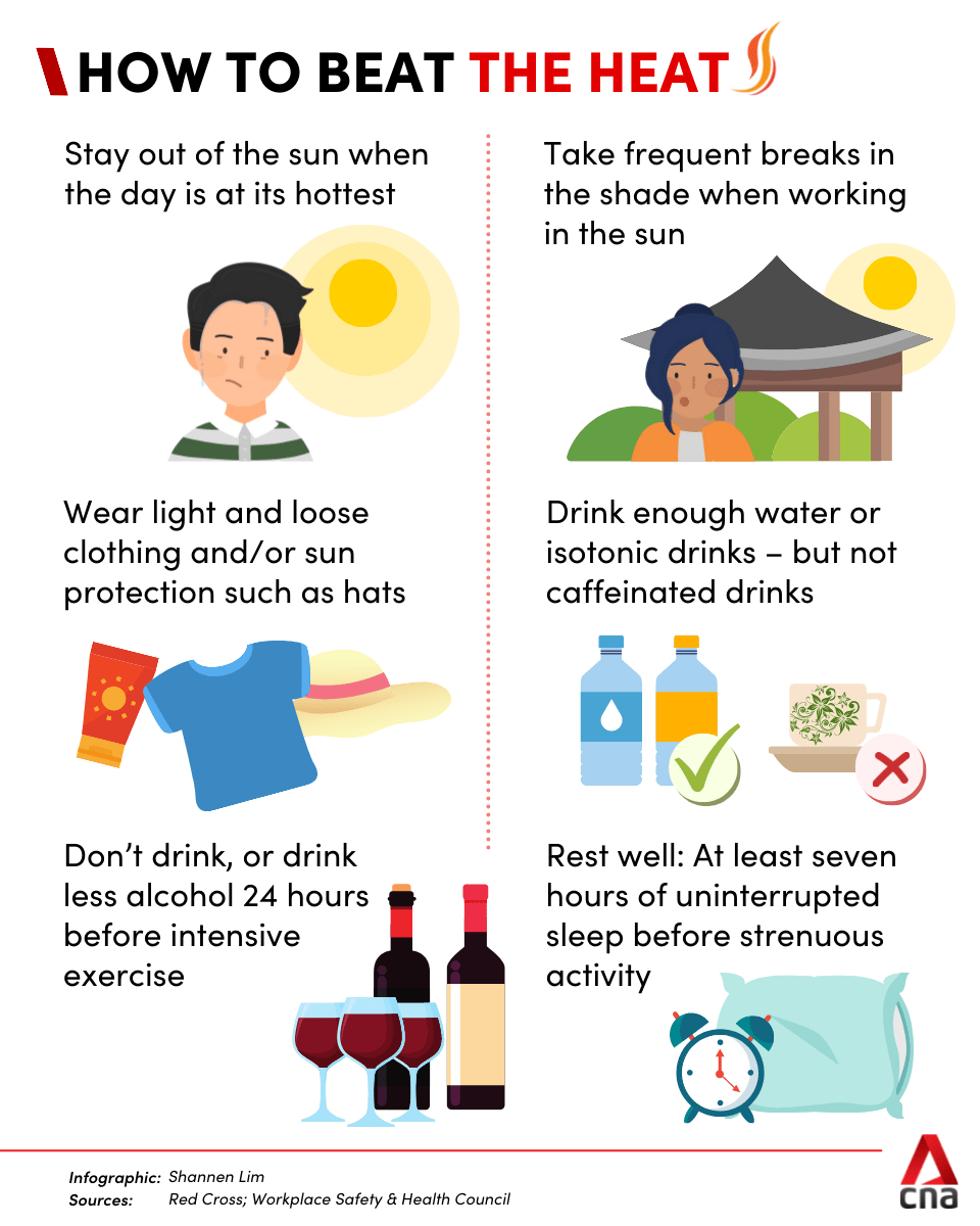 Certain groups of people should also take more care. Keep a look out for soldiers in training, emergency responders, delivery riders and anyone working outdoors, said Assoc Prof Jason Lee, deputy director of the Human Potential Translational Research Programme at the NUS Yong Loo Lin School of Medicine.