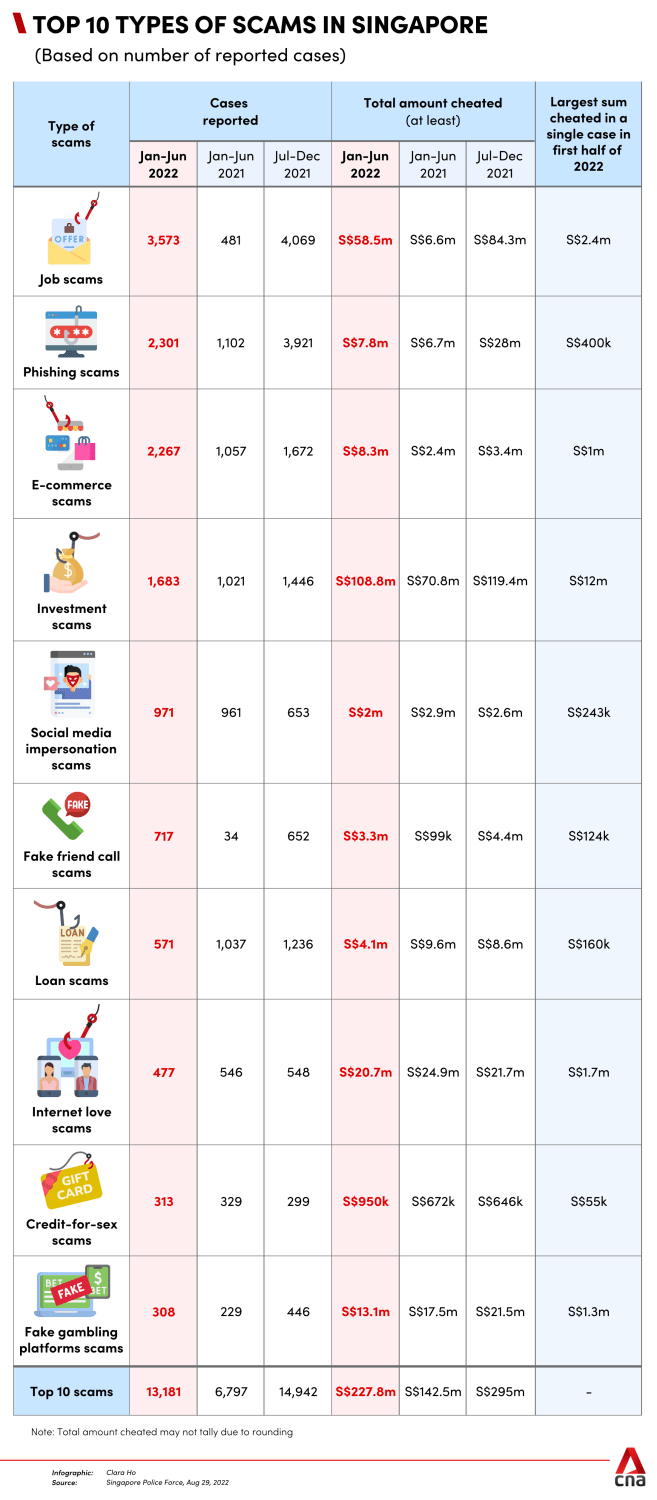 Job scams were the most common type of scam in Singapore in the first half of 2022, with 3,573 cases reported and S$58.5 million lost.