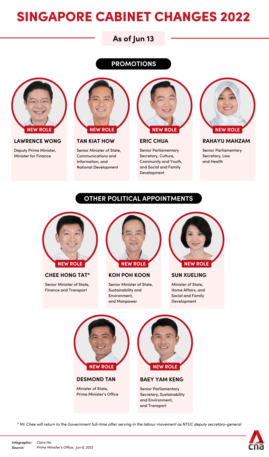 Prime Minister Lee also announced other promotions and switches in portfolios on Monday, but there were no changes to the ministers helming each ministry in this reshuffle.