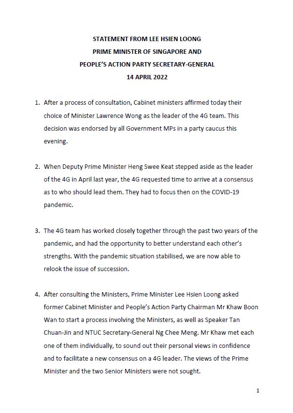 The candidate to succeed Mr Lee, 70, has been up in the air since Deputy Prime Minister Heng Swee Keat stepped aside as the leader of the PAP 4G team last April.