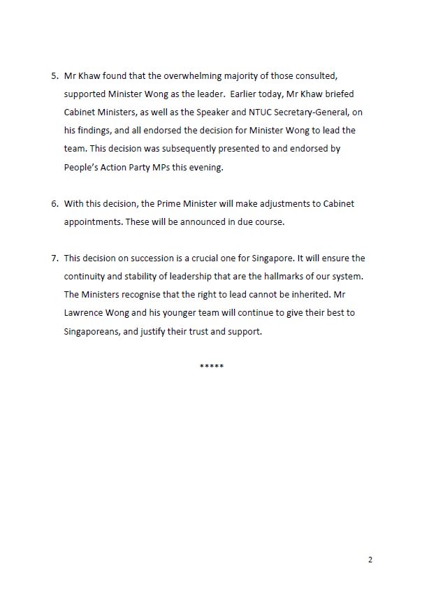 "The Ministers recognise that the right to lead cannot be inherited. Mr Lawrence Wong and his younger team will continue to give their best to Singaporeans, and justify their trust and support."