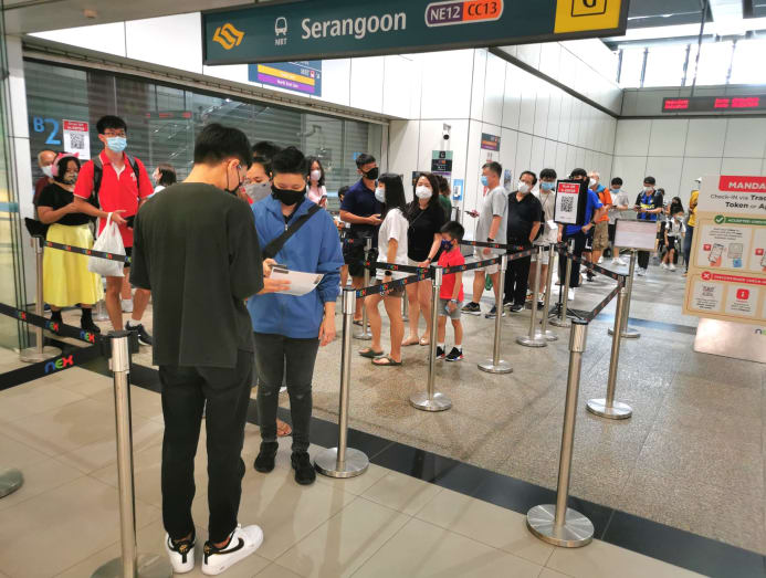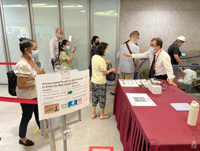 SINGAPORE: Queues formed at the entrances of some shopping malls on Wednesday (Oct 13) as checks on people's COVID-19 vaccination status began.
