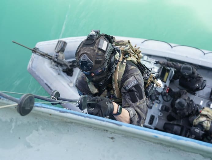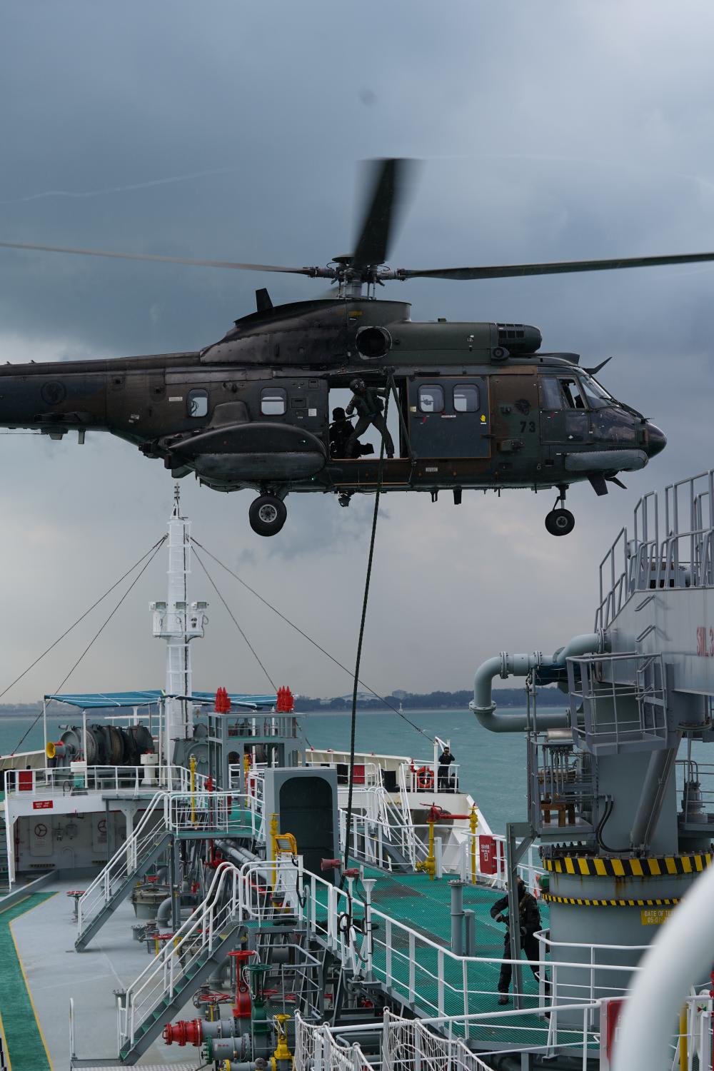 Special Operations Task Force troopers roping down to the hijacked tanker. (Photo: MINDEF)