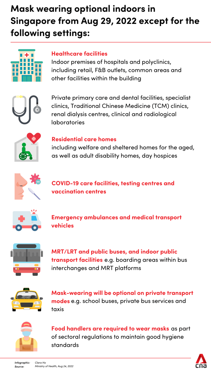 SINGAPORE: From next Monday (Aug 29), people in Singapore will not be required to wear a mask except on public transport and in healthcare facilities, announced Deputy Prime Minister Lawrence Wong on Wednesday (Aug 24).