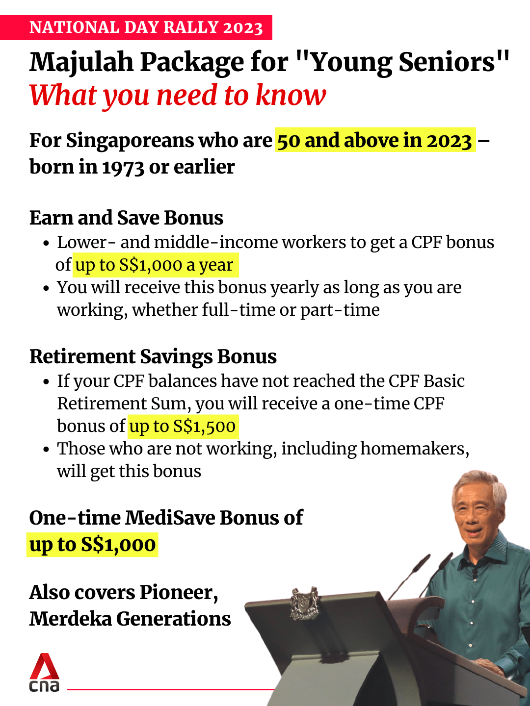 Mr Lee called it the Majulah Package, which is aimed at helping “young seniors” in their 50s and early 60s, especially those with lower incomes and less wealth. But the Pioneer and Merdeka Generations will get this support as well.