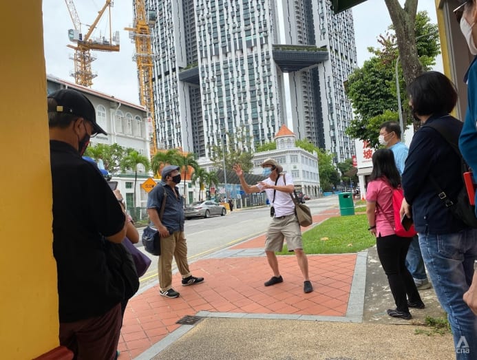 Mr Peter Tay guides participants on a twilight tour of Chinatown focusing on the women of early Singapore. (Photo: CNA/Try Sutrisno Foo)