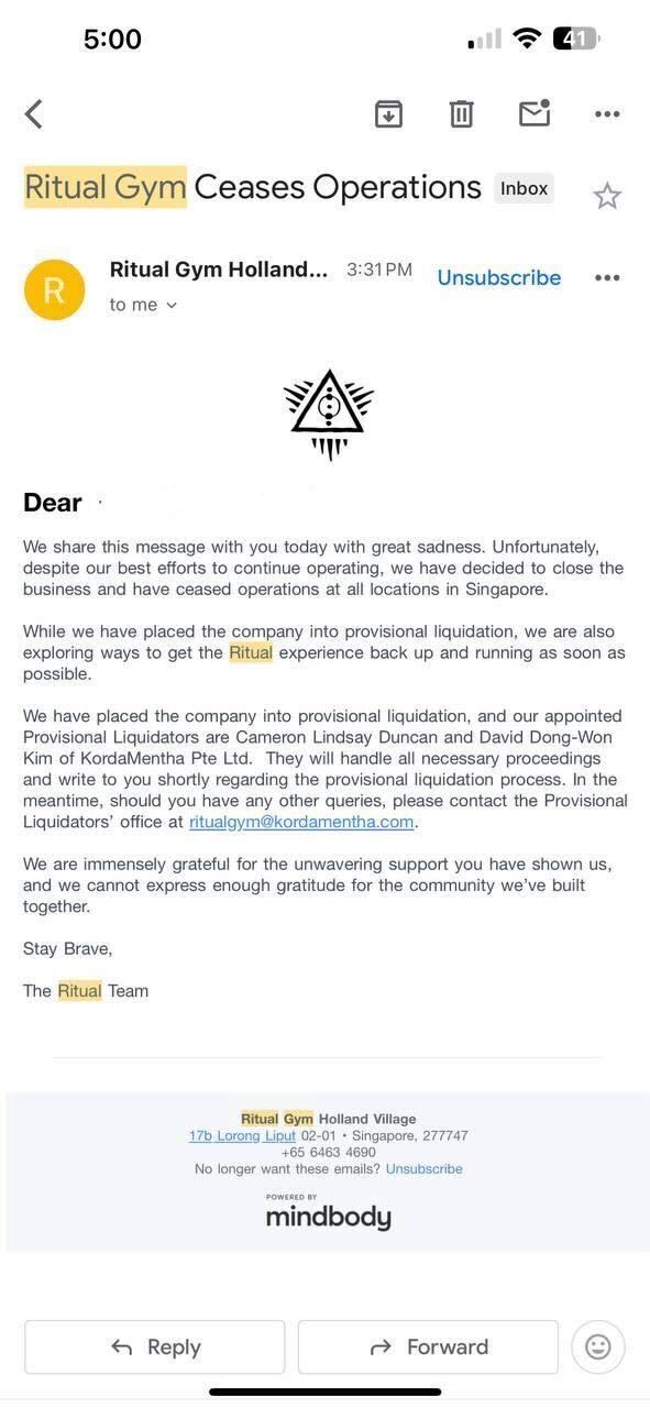 SINGAPORE: Singapore gym chain Ritual has ceased operations at all four outlets here, saying it has placed the company in provisional liquidation.
