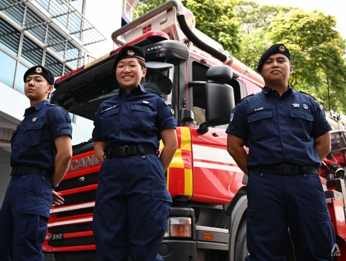 Singapore Civil Defence Force firefighters (from left) Corporal Marco Lim, Lieutenant Juliet Oh and Staff Sergeant Mohammad Yazid Mohammad Yusof were among the 20 involved in the operation to rescue 14 cats from a burning Fajar Road flat. (Photo: CNA/Marcus Mark Ramos)