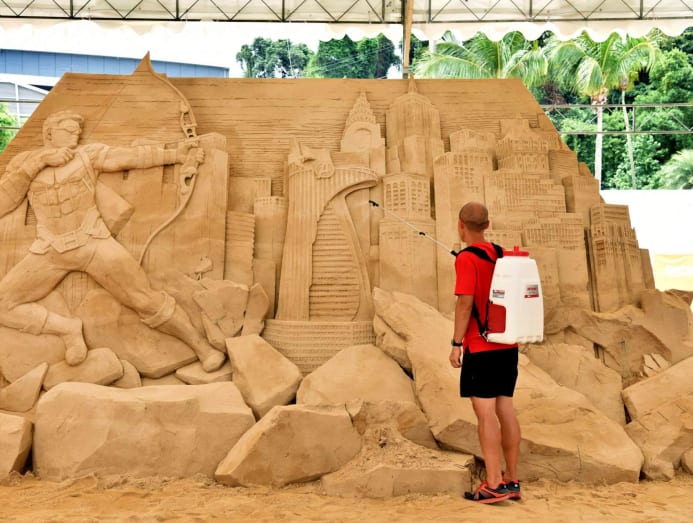 Tan said that Singapore's weather causes the sand sculptures to dry faster, so they have to be sprayed with a water-soluble mixture from time to time to create a protective layer over them.