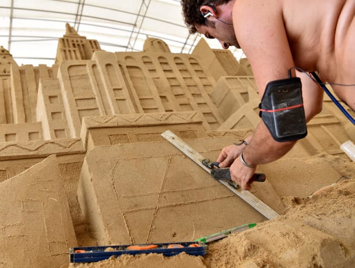 Sand is compacted by machines into massive wooden sand boxes, and hosed down with water to pack the sand down even further. This makes the sand compact and ready for sculpting, Tan told Channel NewsAsia.