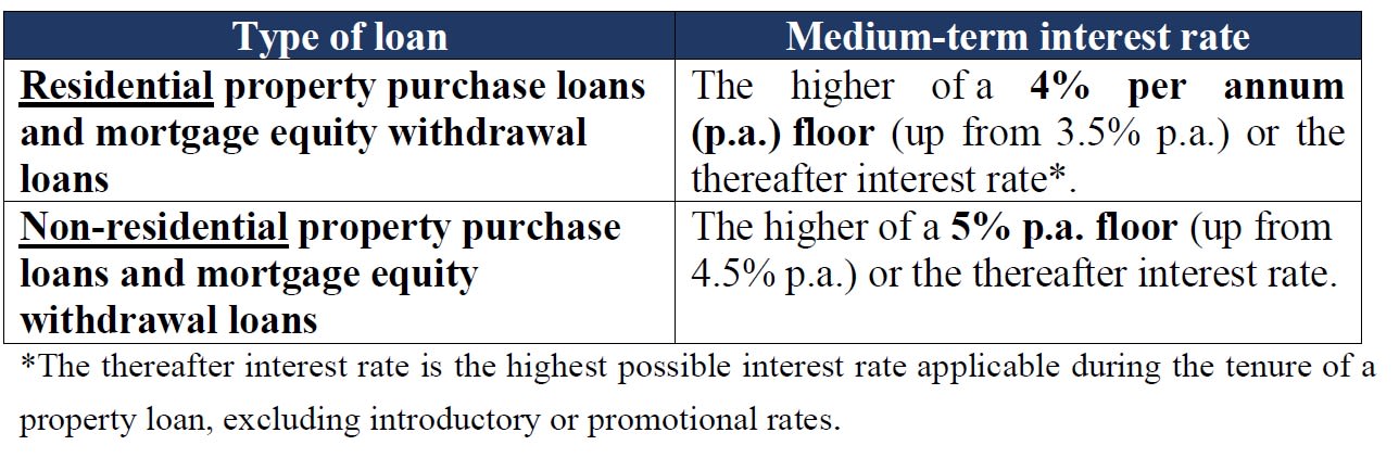 For property loans from private financial institutions, the medium-term interest rate floor - which is used to compute the total debt servicing ratio (TDSR) and the mortgage servicing ratio (MSR) - has been raised by 0.5 percentage point.