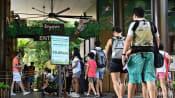 FILE PHOTO: Visitors walk past a sign for the Universal Studios Singapore theme park on the resort island of Sentosa in Singapore on Jul 3, 2020. (Photo: AFP/Roslan Rahman)
