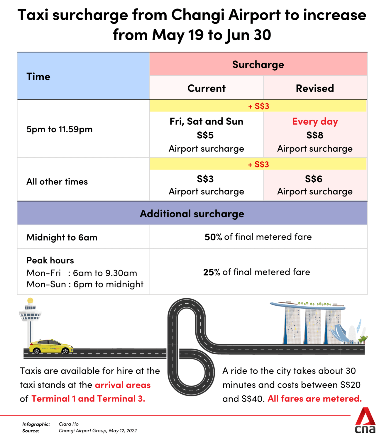 SINGAPORE: Surcharges for taxi trips from Changi Airport will be raised by S$3 from May 19 to Jun 30, the airport said on Thursday (May 12).