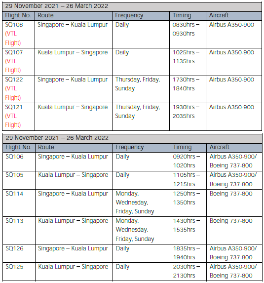"SIA customers with existing bookings on direct flights from Singapore to Kuala Lumpur and Kuala Lumpur to Singapore from Nov 29 onwards, and who booked directly with us, will be proactively re-booked onto new VTL flights subject to availability."