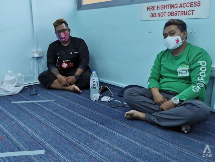 With the dining-in restrictions, the riders, who mostly do their deliveries around the Yishun area have resorted to sitting at roadsides or outside convenience stores to have their meals.