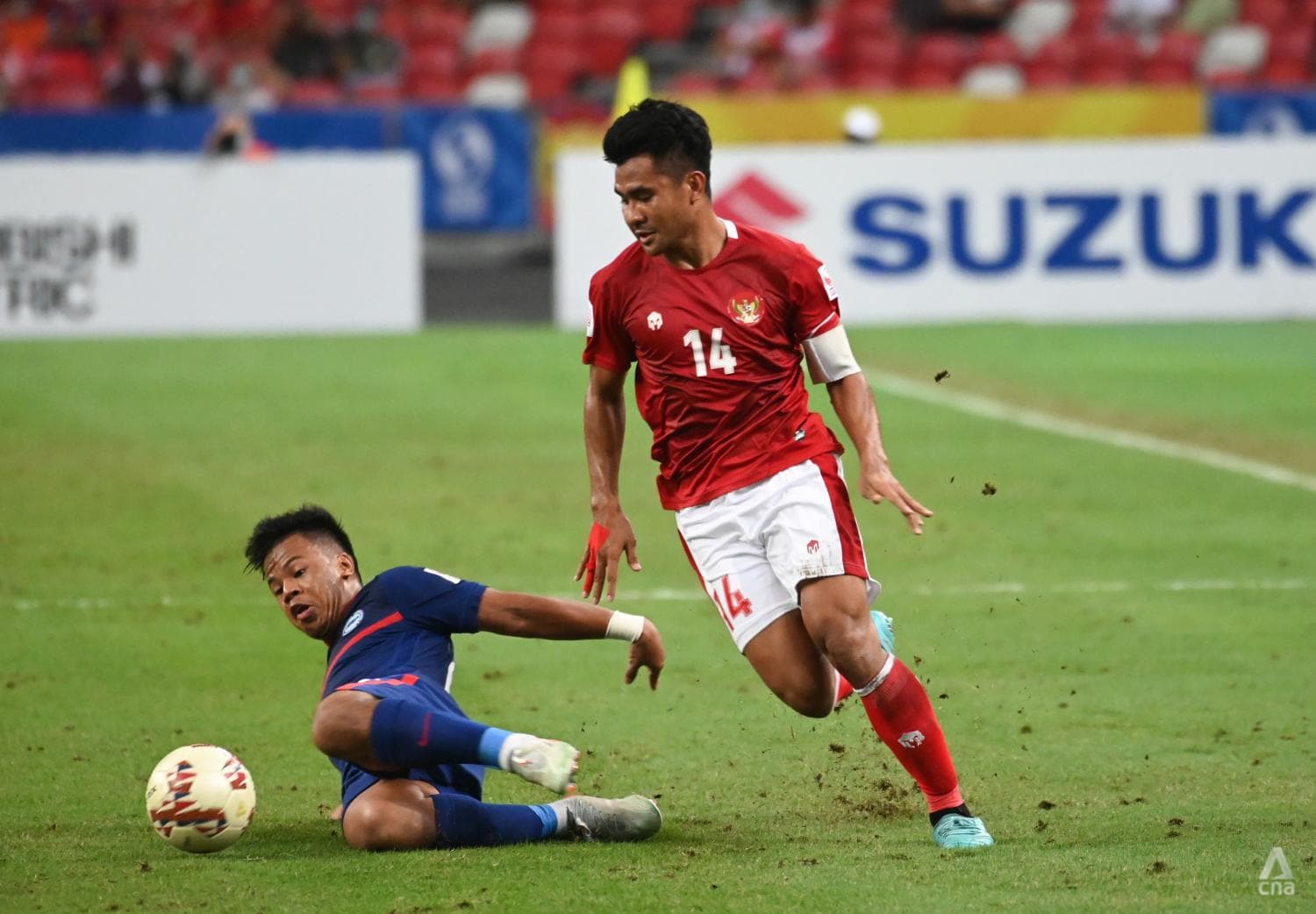 Singapore's Nur Adam Abdullah slides in to stop the ball from getting to Indonesia's Asnawi Mangkualam during their sides' AFF Suzuki Cup 2020 semi-final second leg match at the National Stadium in Singapore on Dec 25, 2021. (Photo: CNA/Matthew Mohan)