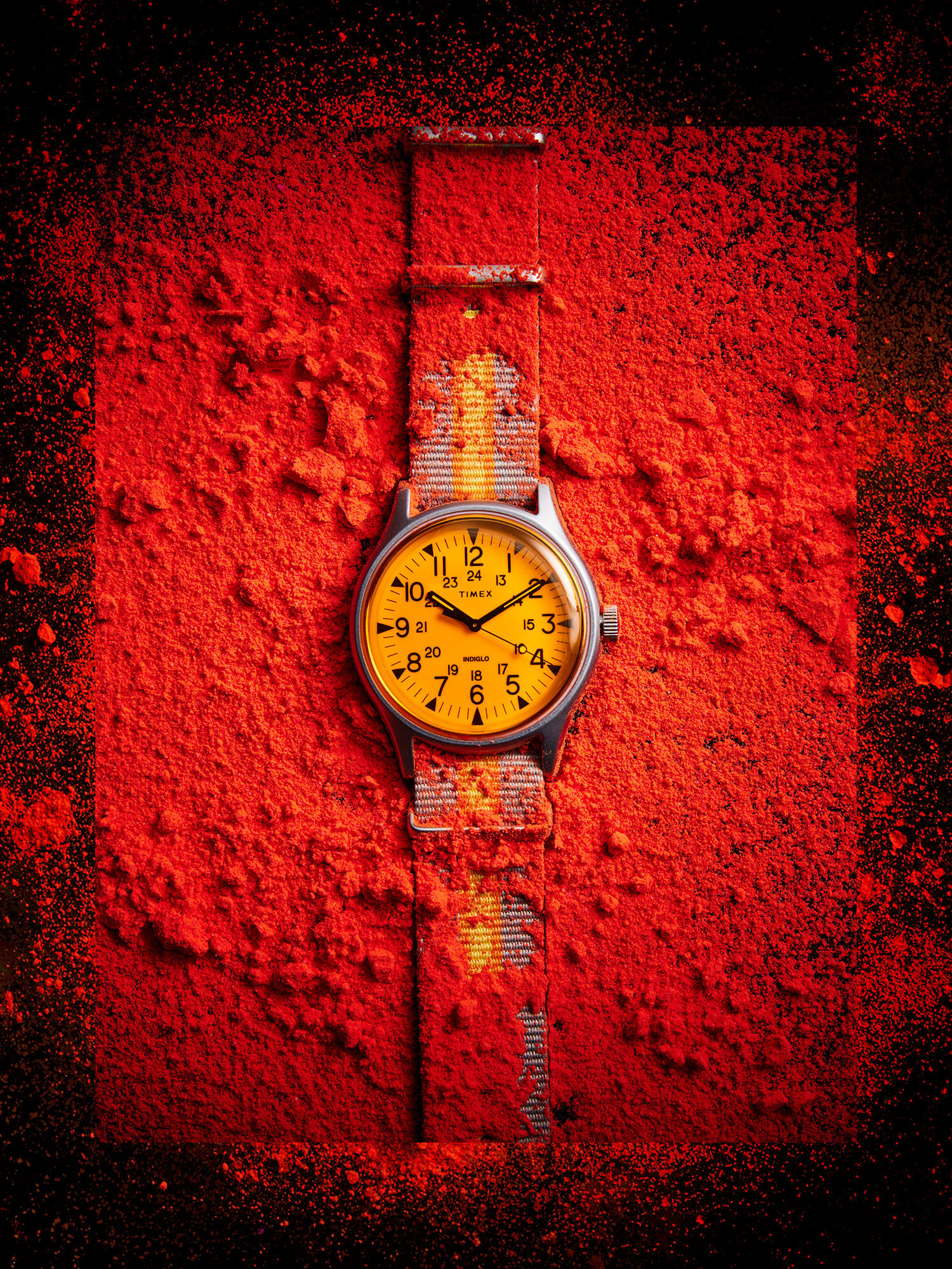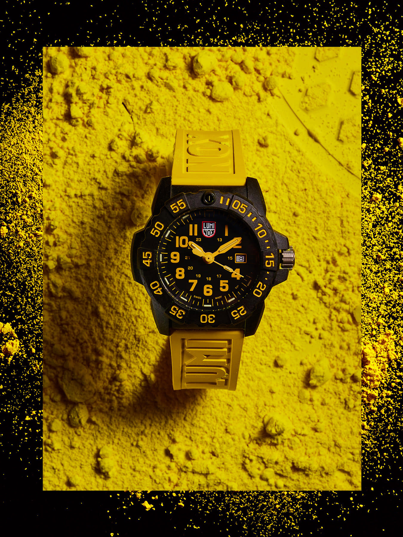 As seen here, bright yellow is used to emulate the look of professional divers’ watches when contrasted with black and thoughtfully applied where it counts. In this case, on the hour markers, hands, and numbered markers on the bezel for a clear reading of the time or other time calculations – besides the statement-making strap, of course.
