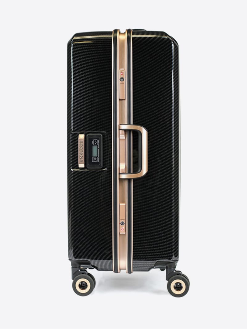 With a scale powered by a small long-lasting watch battery that is removable, you won’t end up at the airport with an overweight bag. The black polycarbonate shell and rose-gold trim case is lightweight while the Hinomoto wheels and shock absorbers are set to easily navigate any terrain.