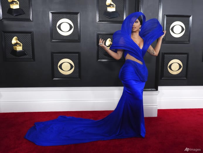 And Cardi B wore bombshell royal blue with huge shoulders and a headpiece over one eye. “I'm trying, I'm trying,” she told photographers as she carefully walked down the carpet.