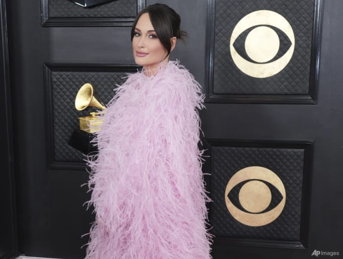 Kasey Musgraves also took the Barbie note with a feathery cape in a lighter pink hue over a catsuit.