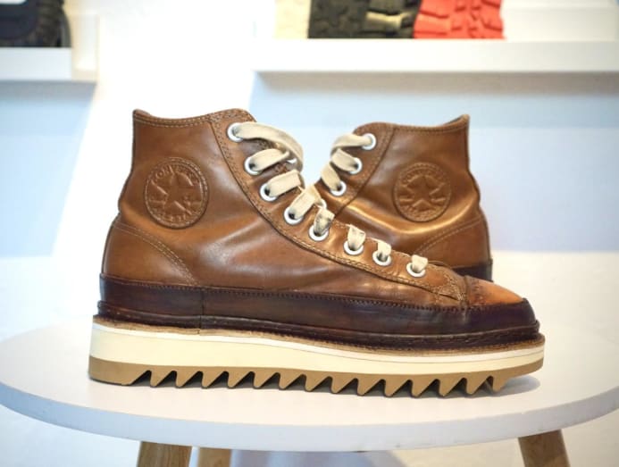 So, expect a fashionable twist to your repair job when you send it to his shoe workshop. Some creative repairs he has previously done include adding a leather welt (a leather strip that is sewn on the outsole of the shoe) and commando lug soles to a pair of New Balance sneakers so that they look more formal. On another occasion, he turned Converse sneakers into “sneaker boots” with some new leather detailing and by adding thick chunky soles.