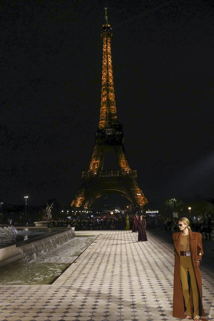 Dramatic 80s shoulders, column silhouettes – and hoods – harked from the heyday of the late Yves Saint Laurent at the Parisian stalwart's Tuesday evening show (Sep 27), all set to the twinkle of the Eiffel Tower.
