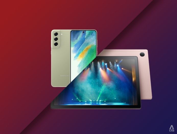 SAMSUNG GALAXY S21 FE 5G, S$1,598 AND GALAXY TAB A8 WIFI, S$448