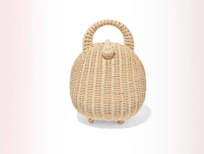 Now, here’s a straw bag with a difference. This spherical-shaped bag is lined with a vivid print created in collaboration with small-scale Brazilian shoemaker Lane Marinho. So you get two designers for the price of one.