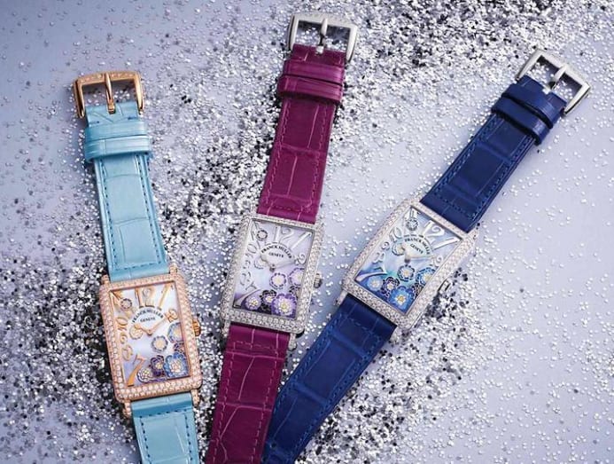 Eight blossoms are scattered on the mother-of-pearl dial, each one boasting hand-painted petals. The dials are also spray-painted on the underside, with the colours visible topside. Six different versions are available, either in stainless steel or rose gold with diamonds, and matched with alligator straps.