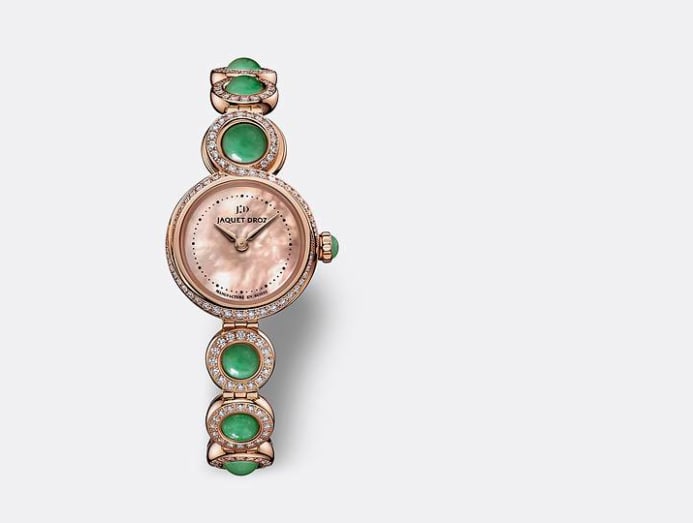 The watch is also issued in a limited edition of eight pieces. Finally, the crown is set with a jade cabochon. When a user goes to set the hours and minutes, touching the stone will remind her of how precious time is. Powered by an automatic movement, this diamond-set, 18K red gold creation is completed by a mother-of-pearl dial.