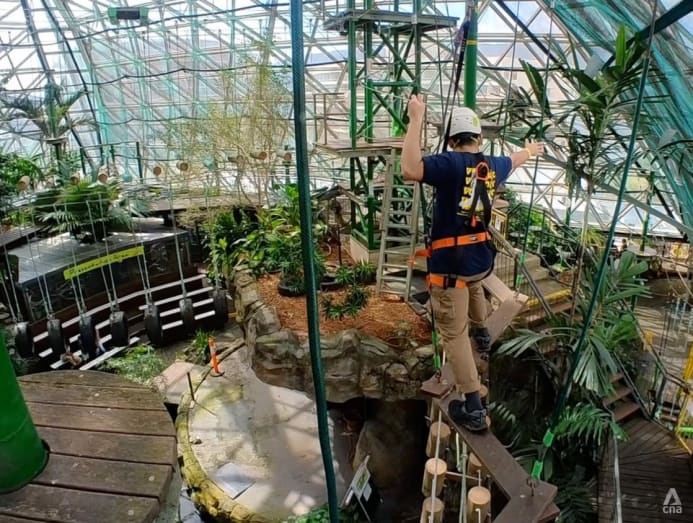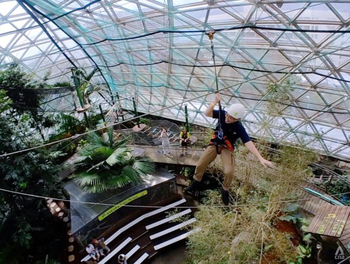 Instead, I was suspended 10 metres up in the air, clearing a high element rope course, ziplining over a saltwater crocodile enclosure, walking on a steel platform circumambulating the dome’s exterior, and jumping down a 13-metre tower. All within an indoor mini-zoo and adventure park situated on the roof of a casino building.