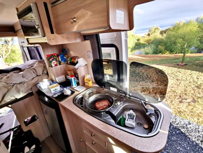 Our campervan came with a microwave, toaster, refrigerator, and electric kettle – all of which can be used when you’re plugged in at a campervan site. Other times, you will have to count on the gas stove.