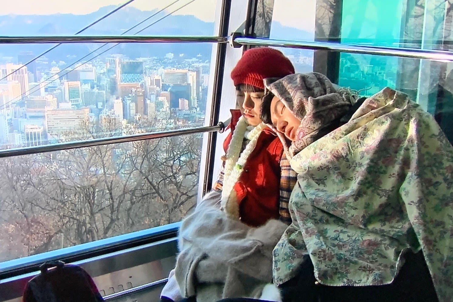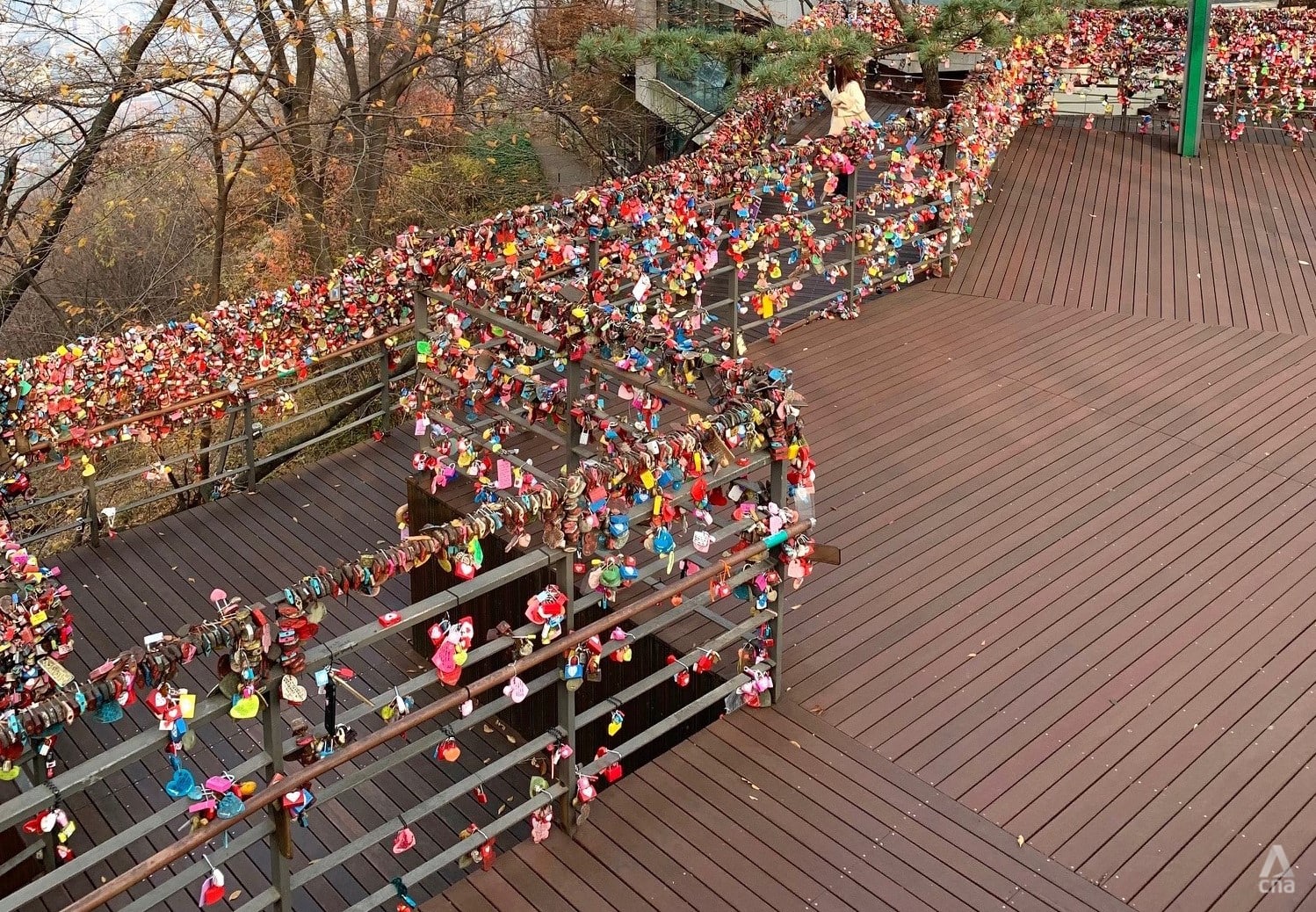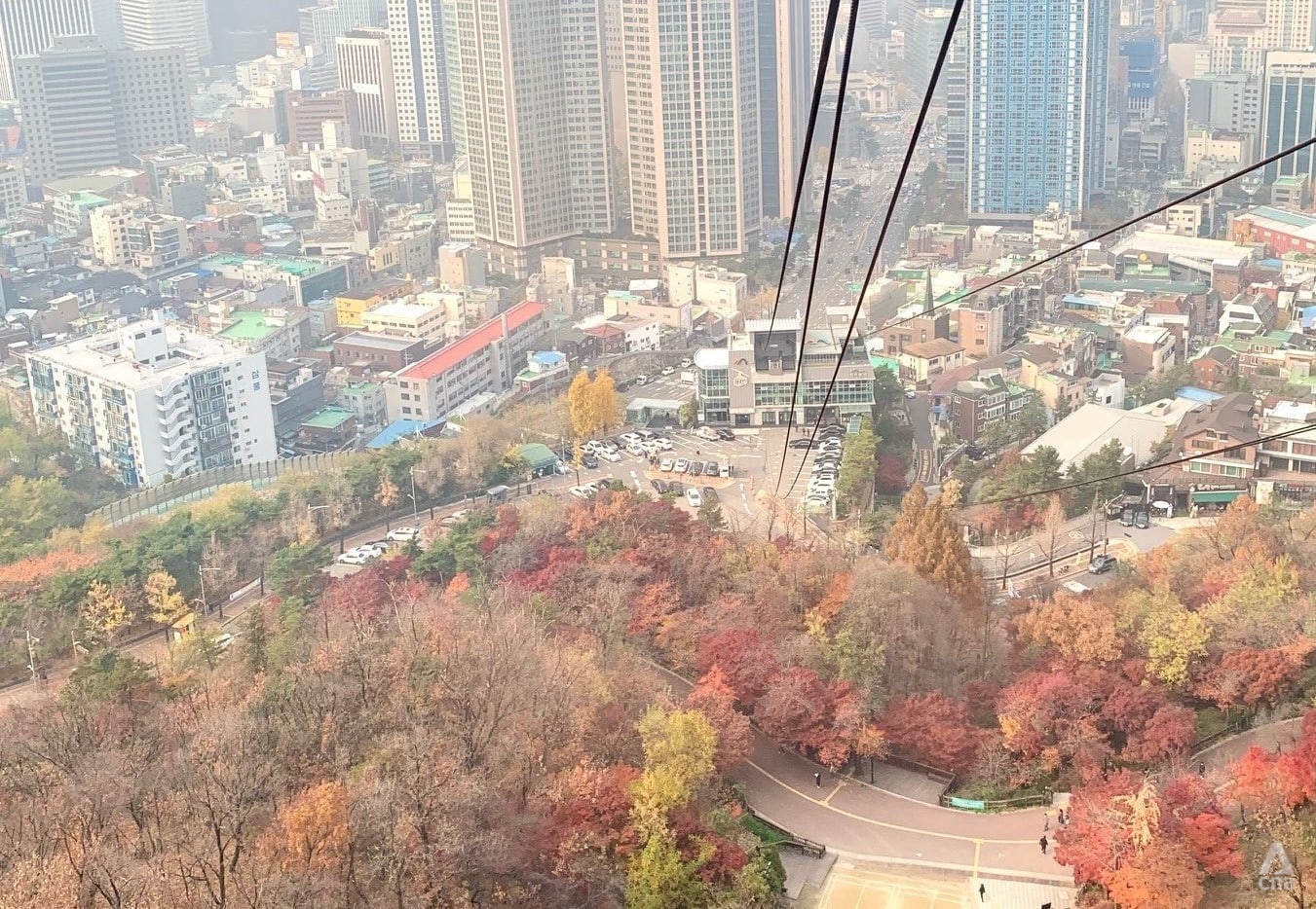 It wasn’t quite winter yet when we rode the cable car up to the base of N Seoul Tower (it has four observation decks and a revolving restaurant on the fourth one). But the air felt instantly cooler and fresher. The autumnal scenery was an explosion of red and gold from up here – a different view from Noksapyeong Bridge for sure.