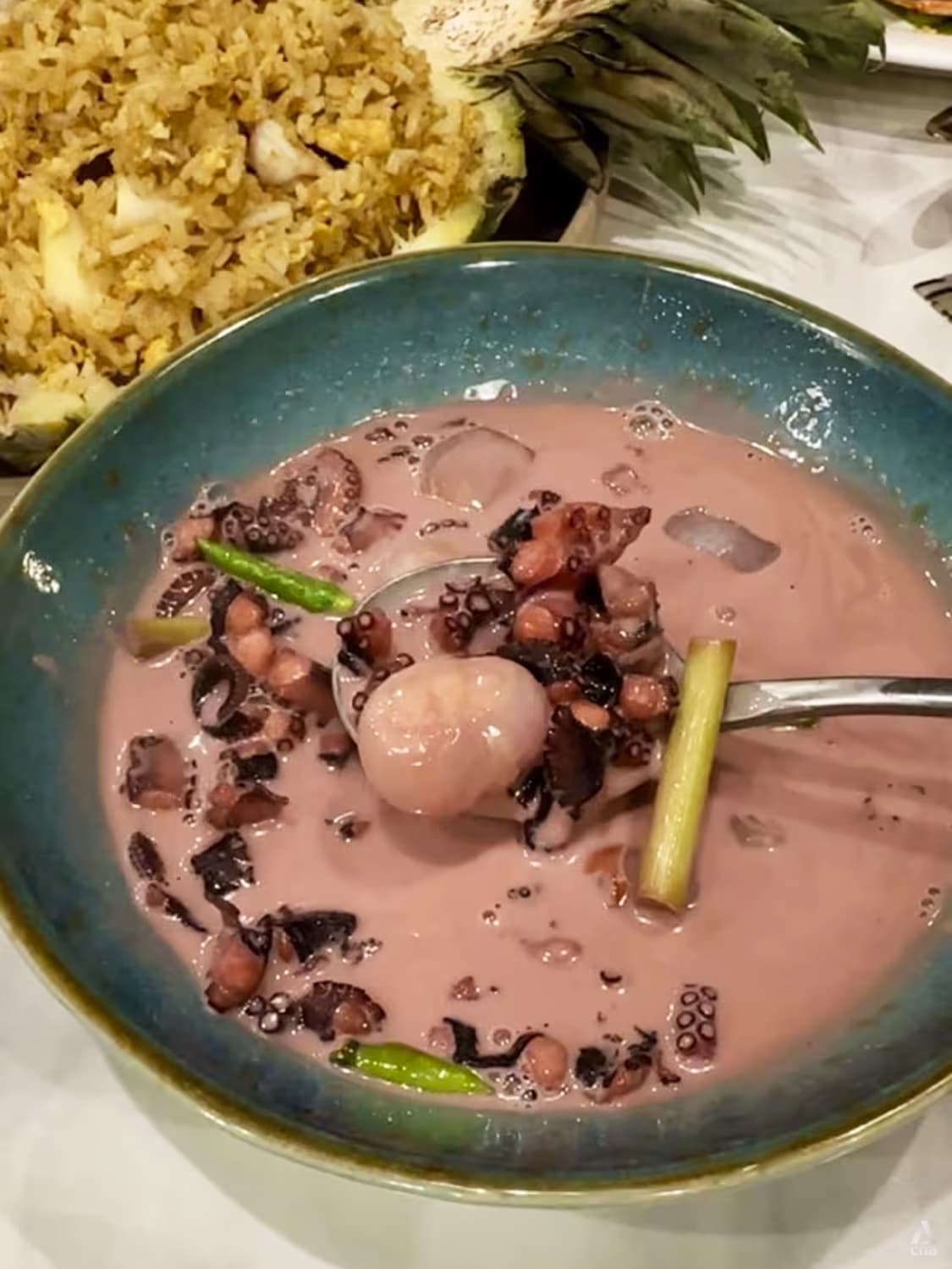 This dish stood out by a mile because it looks like, well, pink bubblegum soup. Its purplish-rose colour comes from the cooked octopus, and the sweet milkiness of the dish is balanced out by the addition of shrimp paste, fragrant lemongrass, chilli and, at this restaurant, pearl onions.