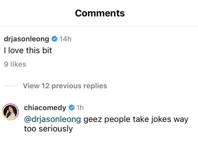 Malaysian comedian Jason Leong appeared to support her, writing “I love this bit”, to which Chia replied: “Geez people take jokes way too seriously.”