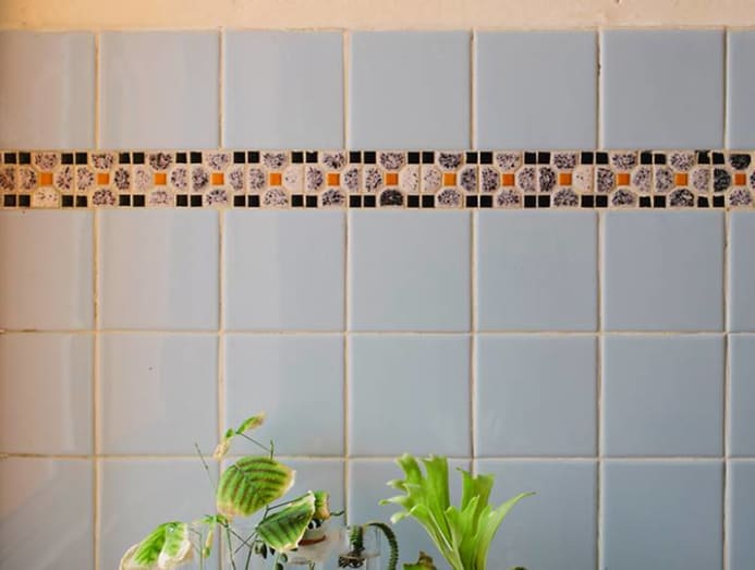 The original square pastel blue wall tiles, accented by a narrow strip of mosaic in graphic black, white and orange, were preserved, as was the cement flooring.