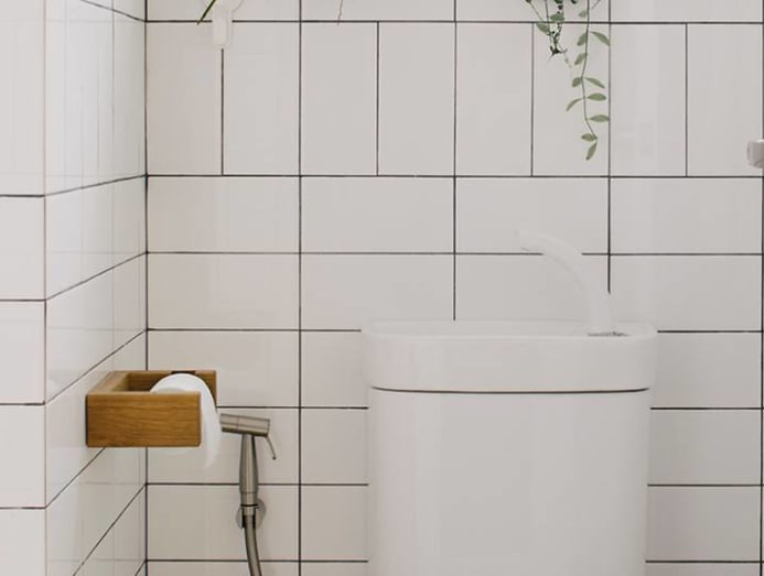 The toilet bowl fixture features a wash basin above it with a water recycling feature was installed, making it a truly eco bathroom.