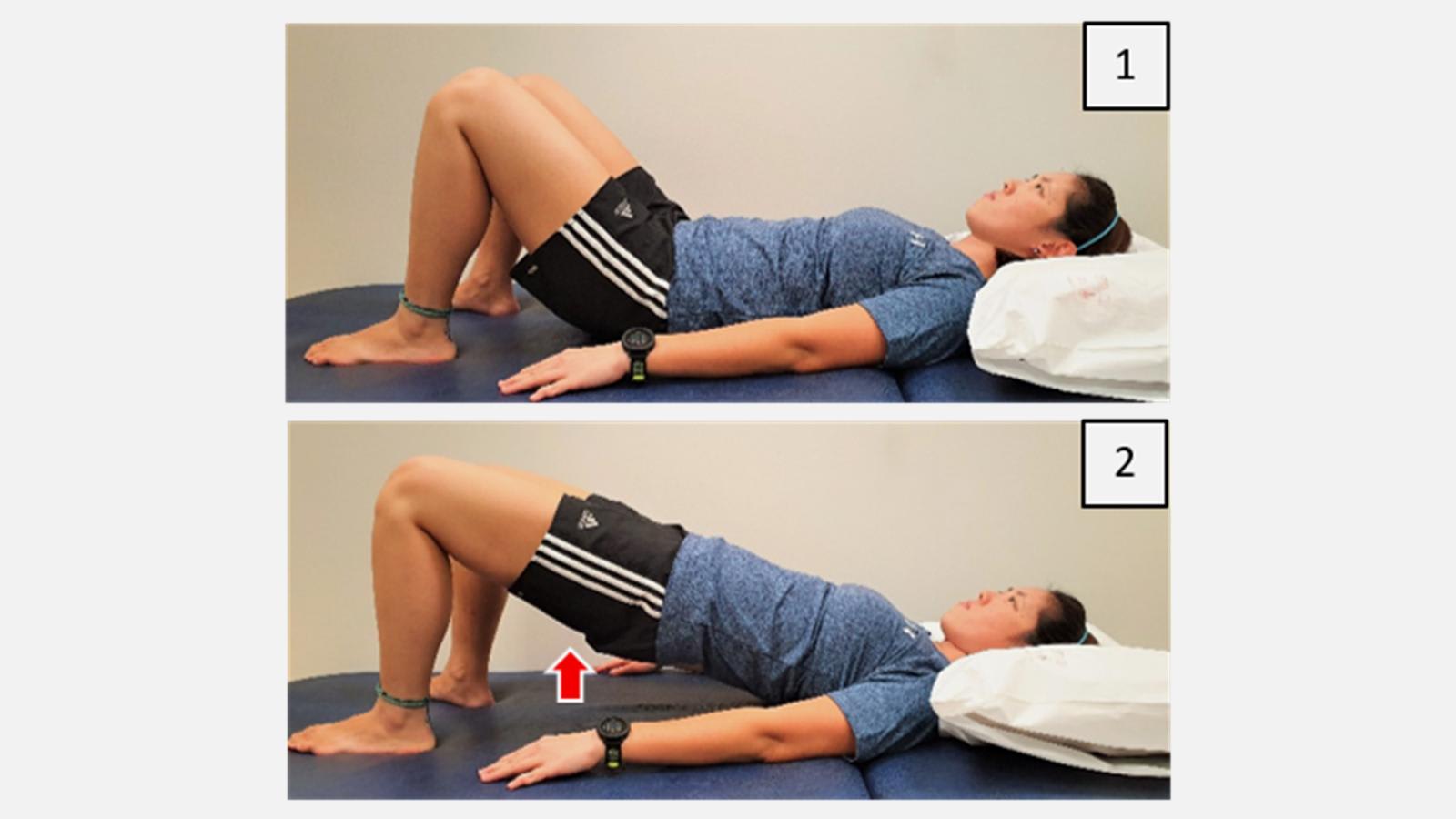 - Squeeze buttock muscles and lift buttocks off ground. Hold for 3 seconds. Repeat 10 to 15 times. Complete 3 sets a day.