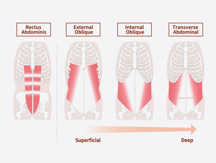 Of course, other than the rectus abdominis, there are other abdominal muscles that make up your core, including the external obliques, internal obliques and the deeper transversus abdominis (or transverse abdominal) and pelvic floor muscles, that provide stability, support movement and aid in breathing.