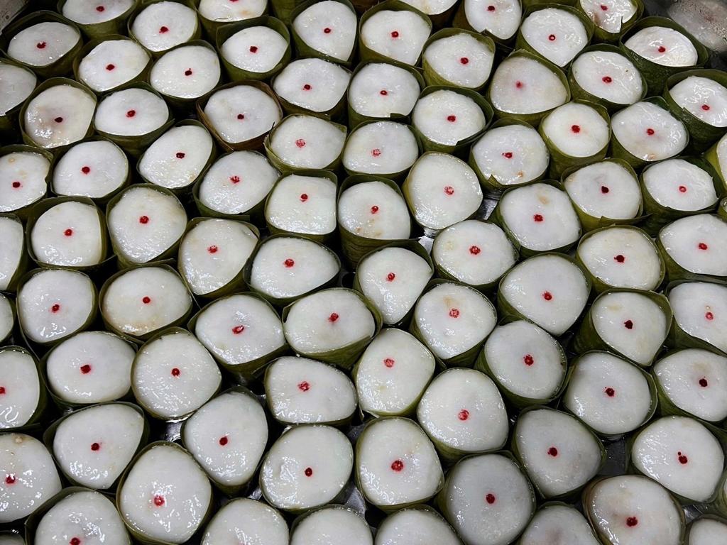 Then, she adds a special filling of peanut, sesame, ginger, shredded coconut, brown sugar, gula melaka and two secret ingredients, wraps the kueh in banana leaves, and steams it until it is soft and fragrant. She sells this traditional Hainanese kueh at her shop, All Things Hainanese.