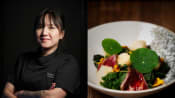 Qantas executive chef Linda Sim with her signature crayfish laksa and a Qantas First Lounge staple, salt and pepper squid with green chilli dipping sauce and aioli. (Photos: Qantas; Grace Ma)