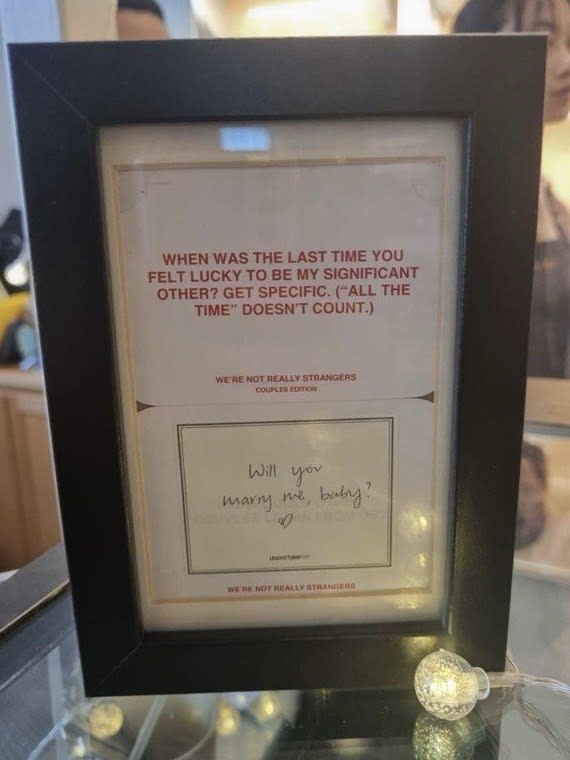 She carefully arranged the sequence and, fortuitously, the previous card said, “Tell me about the time you felt lucky that I was your significant other.” It was the perfect segue for a marriage proposal.