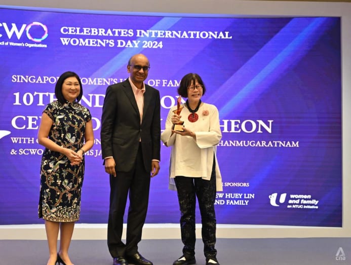 The 10 inductees of the 2024 Singapore Women’s Hall of Fame with President Tharman Shanmugaratnam, Jane Ittogi Shanmugaratnam and Junie Foo, President of Singapore Council of Women’s Organisations. (Photo: CNA/Jeremy Long)
