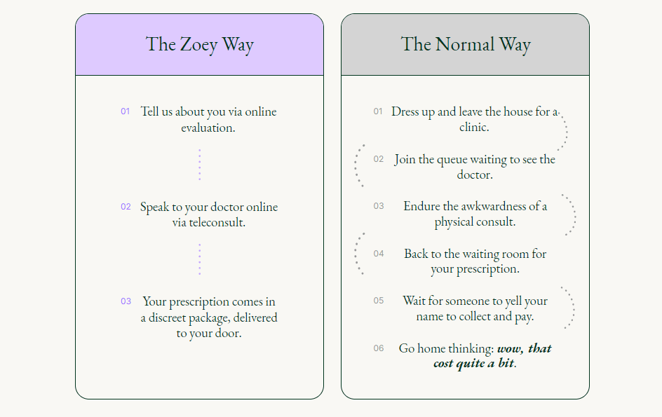 The latter might require you to do a hormone test, which you can purchase on the Zoey website and conduct yourself at home, before popping the results in the mail to be sent to the diagnostics centre.